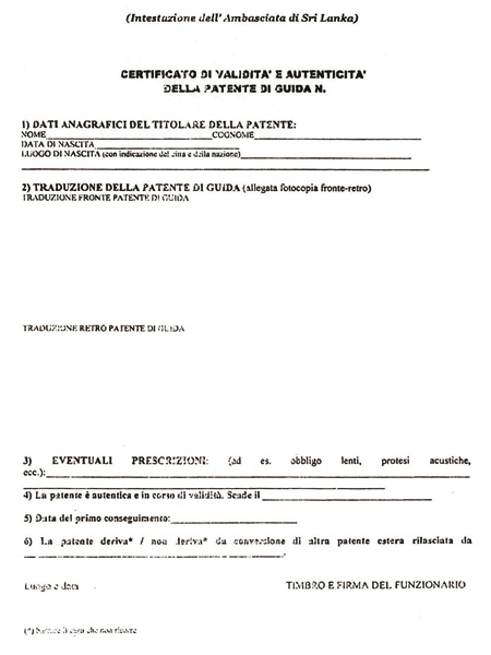 La competente Autorità srilankese che effettua la conversione può chiedere, in aggiunta alla documentazione di rito, la traduzione ufficiale della patente di guida italiana. La stessa Autorità può chiedere, per il tramite delle Rappresentanze Diplomatiche italiane, informazioni alle competenti Autorità italiane ove sorgano dubbi circa la validità e l'autenticità della patente ed i dati in essa riportati.