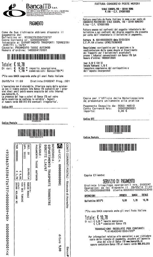In allegato alla presente si fornisce il fac-simile dell'attestazione di pagamento rilasciata dai punti di servizio ITB, che riporta, oltre all'importo del pagamento effettuato e al conto corrente postale sui cui è stato effettuato il versamento, i codici di sicurezza che consentono agli sportelli UMC di effettuare le operazioni di riscontro, secondo le modalità già in essere.