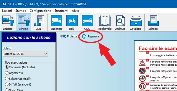 - nella modalità di esercitazione collettiva "schede fac-simile da esame" vengono visualizzate sullo smartphone dei candidati solo le immagini ministeriali, come accade in sede d'esame. Diversamente, nella modalità di esercitazione collettiva "per argomento", la visualizzazione riguarda tutte le immagini abbinate al quiz, anche quelle extra ministeriali (grafica di SIDA) usate nei manuali e in aula