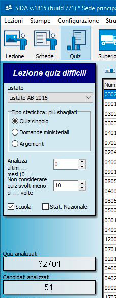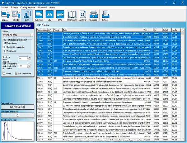 Il docente sta lavorando sul listato della patente A e B 2016 (voce Listato nell'immagine) Il docente sta esaminando i singoli quiz, ovvero le singole affermazioni più sbagliate di tutto il listato ministeriale per la patente A e B (voce "Quiz singolo" nell'immagine) Il docente sta lavorando sulla base della statistica nazionale (casella Stat. Nazionale spuntata) Infatti i quiz analizzati per la statistica sono 647.034.058 (voce "quiz analizzati") |