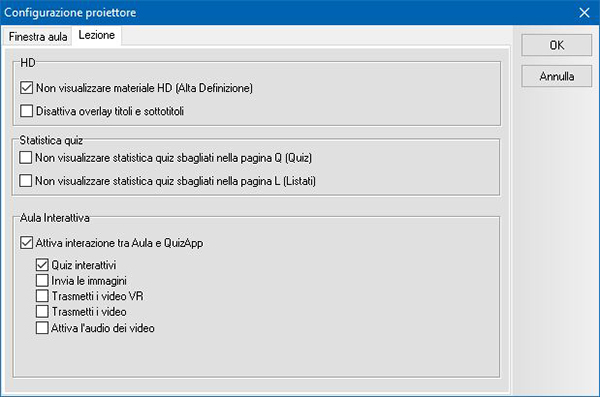 Nella maschera di configurazione del proiettore, mettere il segno di spunta accanto alla scritta "Attiva interazione tra Aula e QuizApp". Premere OK per confermare.